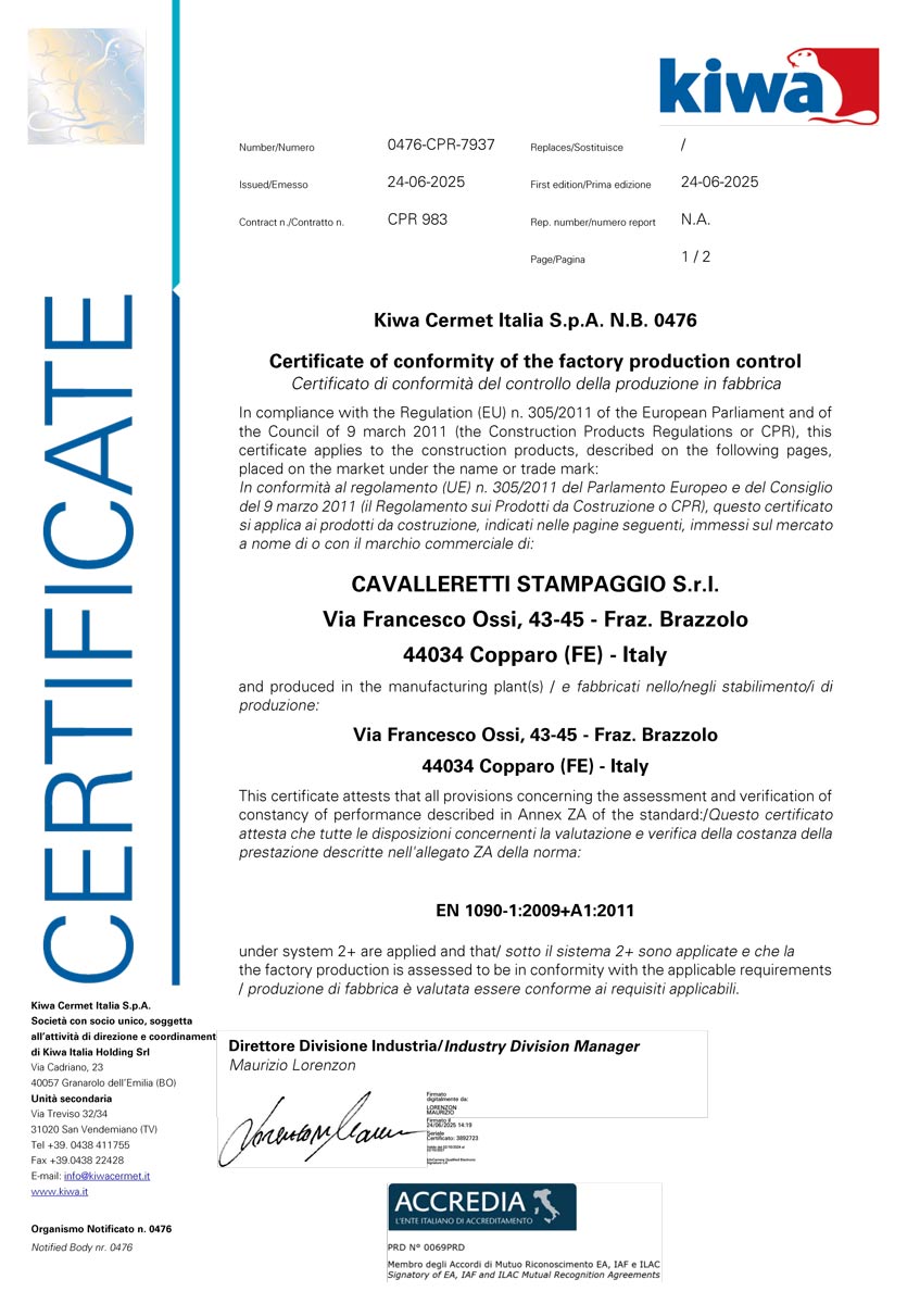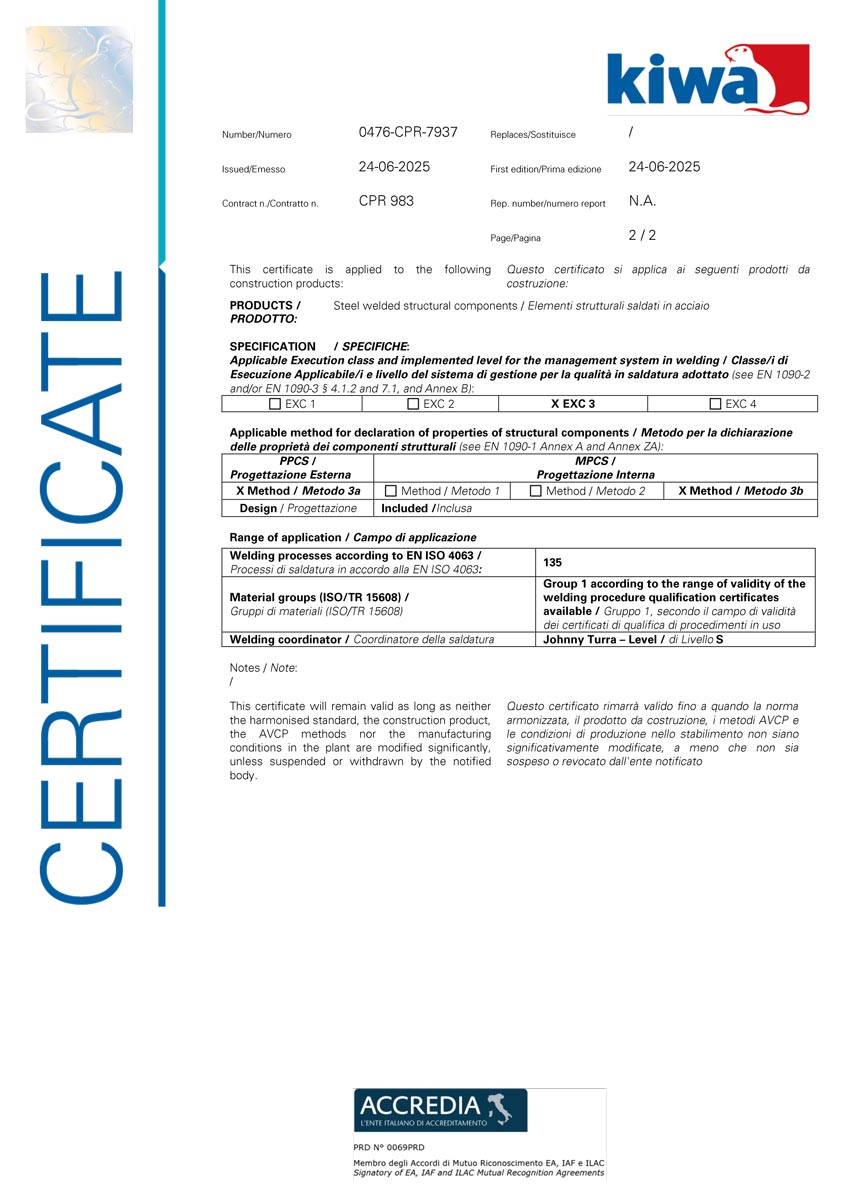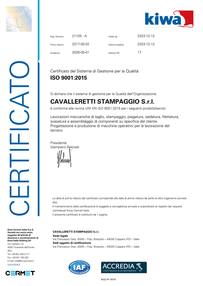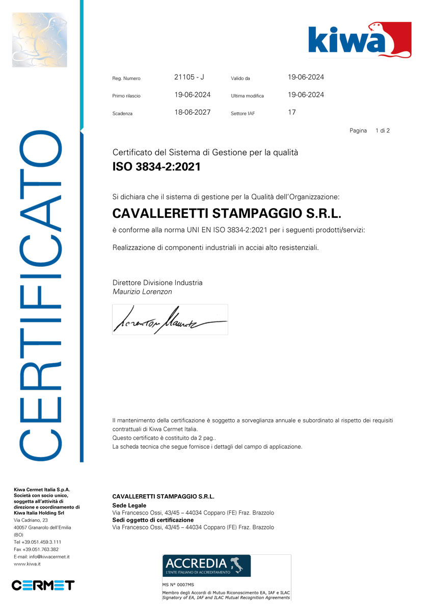 Certificazioni Certificazioni Progettiamo e realizziamo tutte le nostre attrezzature seguendo gli standard di qualità ISO 9001:2015 e ISO 3834-2:2021.