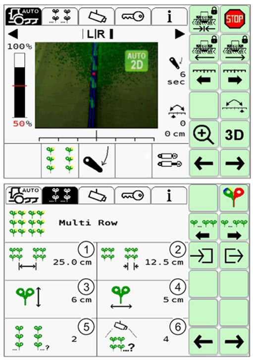Con la funzione 2D la telecamera distingue il colore delle piante da quello del terreno per calcolare il centro della fila. La funzione 3D distingue l’altezza della coltura rispetto alle infestanti. Confrontando costantemente la posizione dell’attrezzo con quella delle piante interviene sulla valvola proporzionale per apportare le correzioni necessarie.